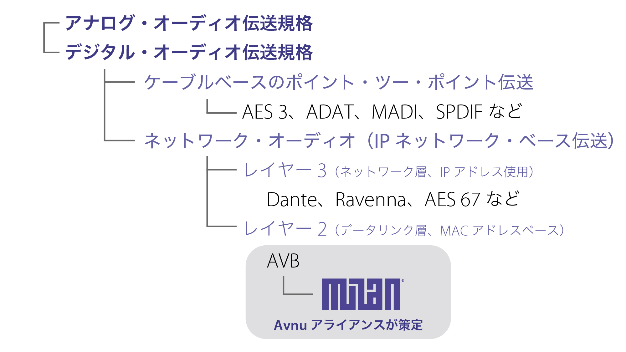 Avnuアライアンスが策定した、AVB規格に基づくプロオーディオ向けネットワーク規格。異なるメーカーの機器間で確実に接続・動作できることを目的とする。 |