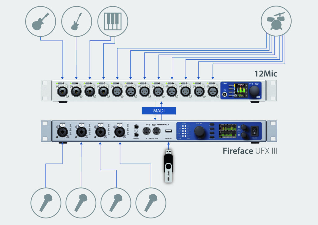 DURec機能を搭載するRMEオーディオインターフェイスに最大2TBの容量のUSBサムドライブやHDD、SSD、そして、USBアダプターを使用したマイクロSDカードを接続することで、接続される全ての入力及び内部ミキサーからの出力チャンネルを録音することが可能です。
