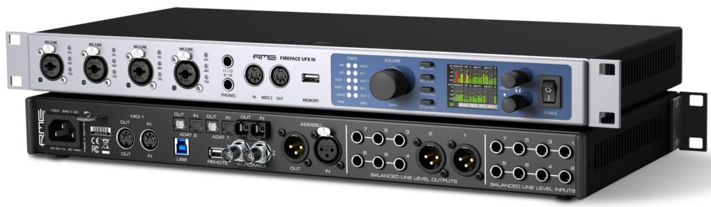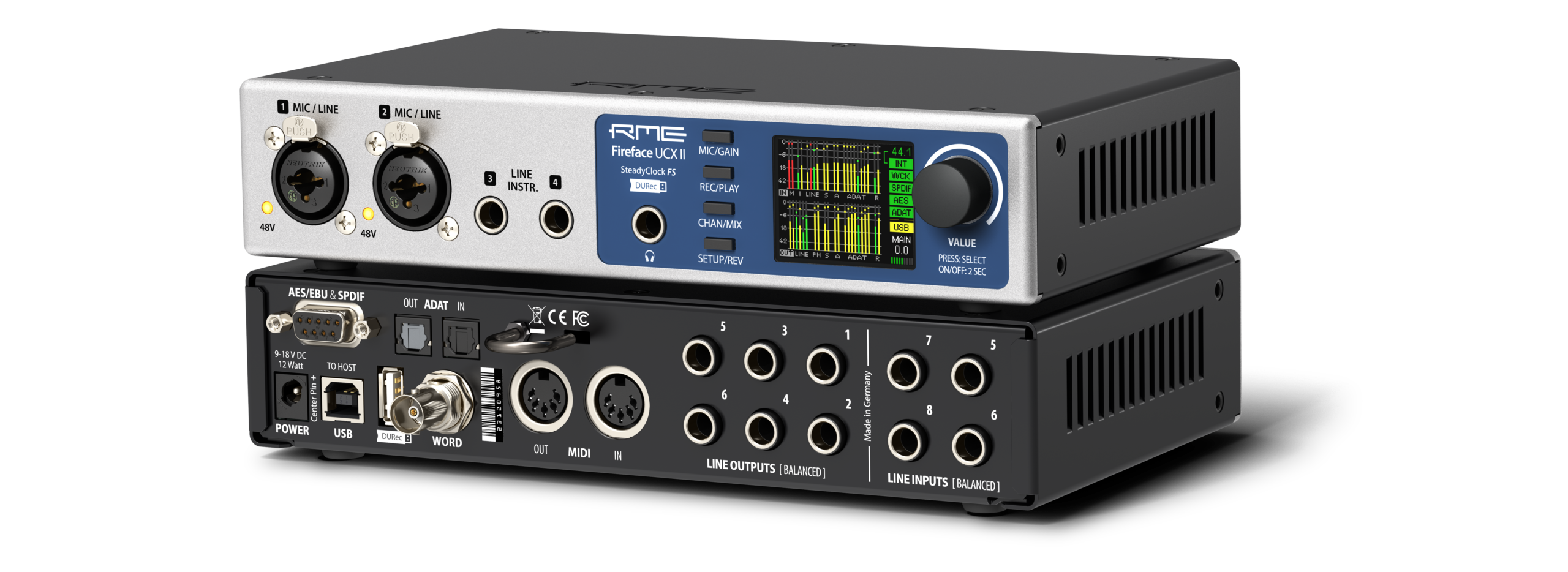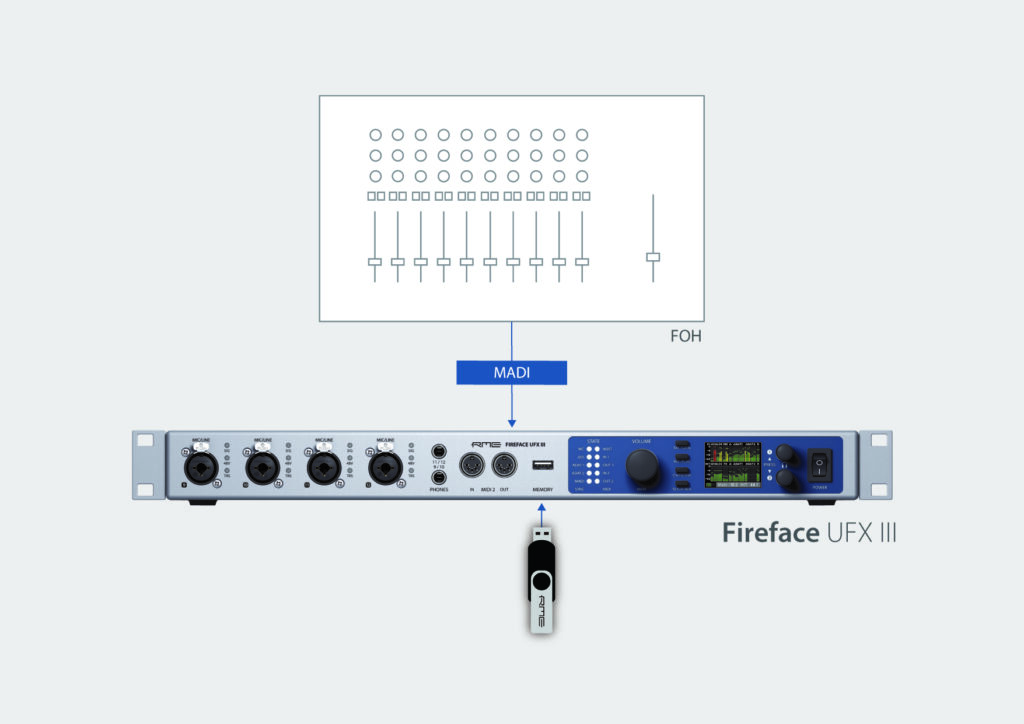 DURec(デュレック)はDirect USB Recordingの略で、Fireface UFXシリーズやFireface UCX IIなどのRMEオーディオ・インターフェイスを業務用のUSBレコーダー/プレイヤーに変貌させる画期的な機能です。この機能の登場により内部DSPにより動作する、RMEオーディオ・インターフェースは、コンピューターを必要としない独立したデジタル・レコーダーとして、ライブ録音、バックアップ録音、リハーサルの確認録音を可能にします。これによって高価なマルチチャンネル・レコーダーを別途用意する必要がなくなります。