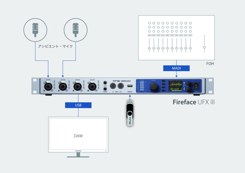ライブ録音ではFOHからの最大64chの信号をMADIで受け、アンビエント・マイクを追加します。メインの録音はDAWで行い、バックアップをDURecで行うことで、2つのパソコンを用意することなく、安全に録音を行うことができます。
