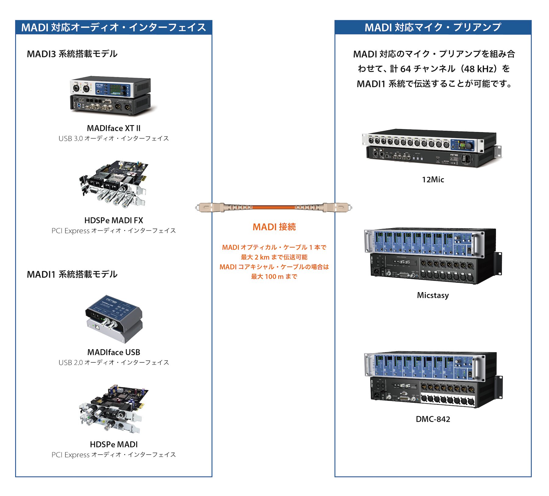 MADIオーディオ・インターフェイスとマイクプリを接続するだけの最小ユニット。接続がMADIケーブルだけで行えるため現場でのトラブル・リスクを最小限に押さえることができます。