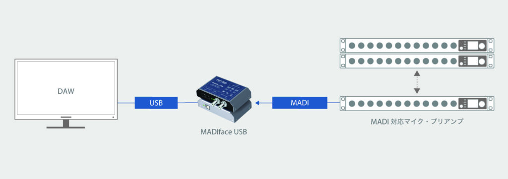 また、MADIはノイズやシグナル劣化の心配なく長距離の伝送が可能ですので、マイクプリはステージ袖に配置し、録音用のPCはステージから離れた場所に配置することもできます。もちろん、マイクプリは接続されたMADIケーブルを通じてリモートコントロールが可能です。