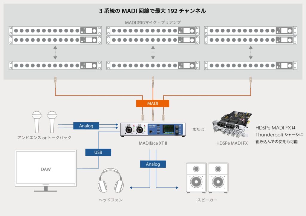 ハーフラックの小さなボディにMADIを3系統搭載しているMADIface XT IIを使えば、最大192チャンネルまでの大規模なMADI録音システムを簡単に組むことができます。たくさんのマイクが必要な収録、特にオーケストラなどの録音に非常に便利な録音システムです。MADI搭載のRMEマイク・プリアンプを必要な台数用意したら、それらをMADIケーブルでカスケード接続し、あとはPCに接続されたMADIインターフェイスにMADIケーブルの終端を差し込むだけでセットアップは完了です。現場で扱うケーブル数も非常に少なくすみますので、トラブルも未然に防ぐことができる上、機材量もスペースも最小限に抑えることができます。