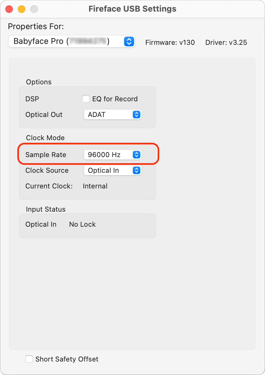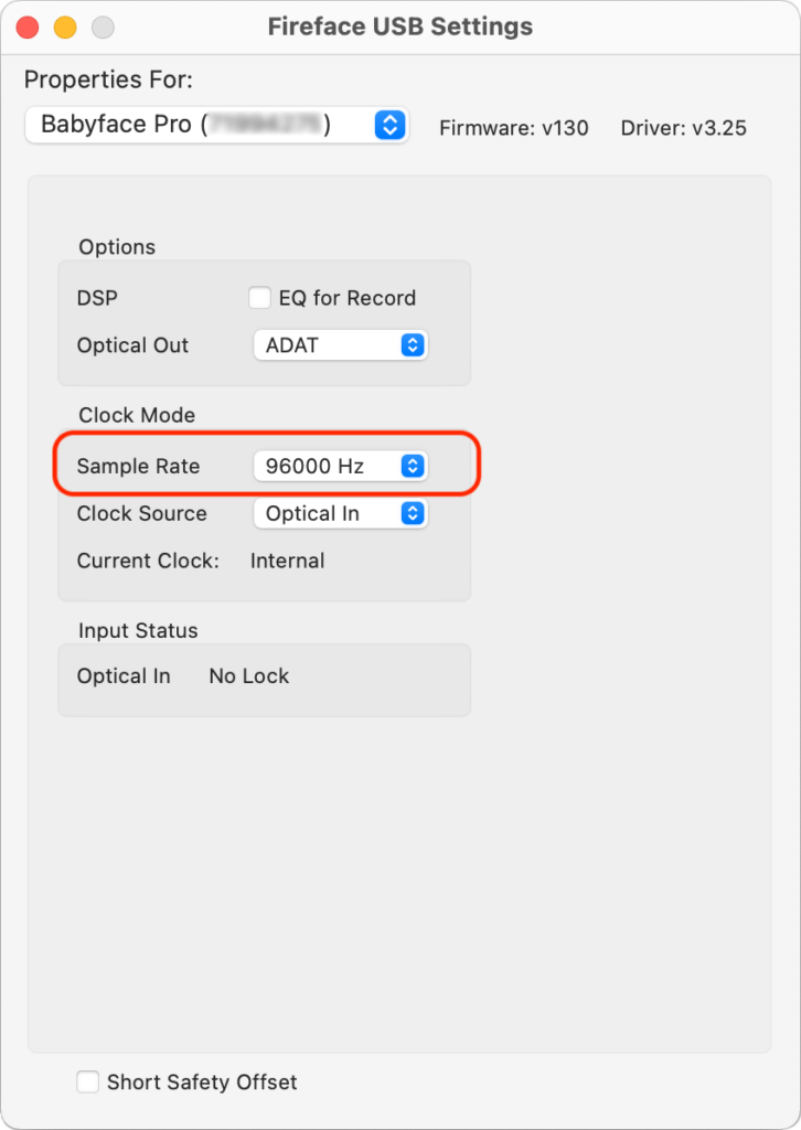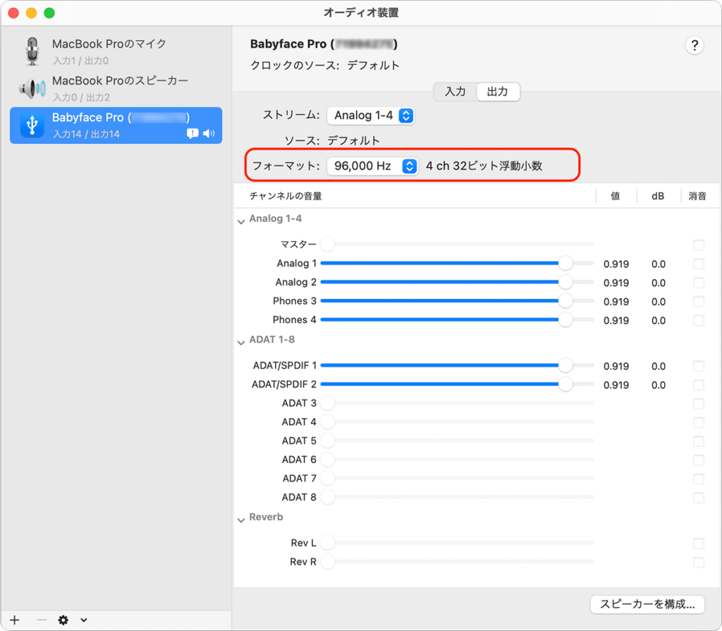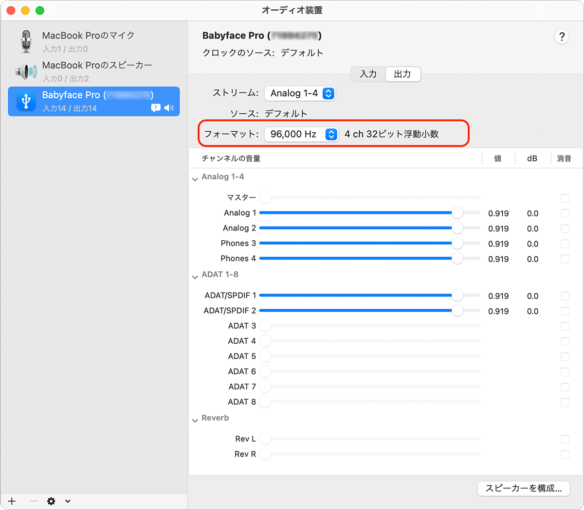 9.再生するファイルのサンプリングレートと、お使いのオーディオ・インターフェイスのサンプリングレートが一致していないと、音は聞こえるものの間違ったサンプリングレートに変換されてしまいますので、必ずFireface USB SettingsまたはMac OSのAudio MIDI設定内で音源のサンプリングレートとオーディオ・インターフェイスのサンプリングレートを合わせてください。