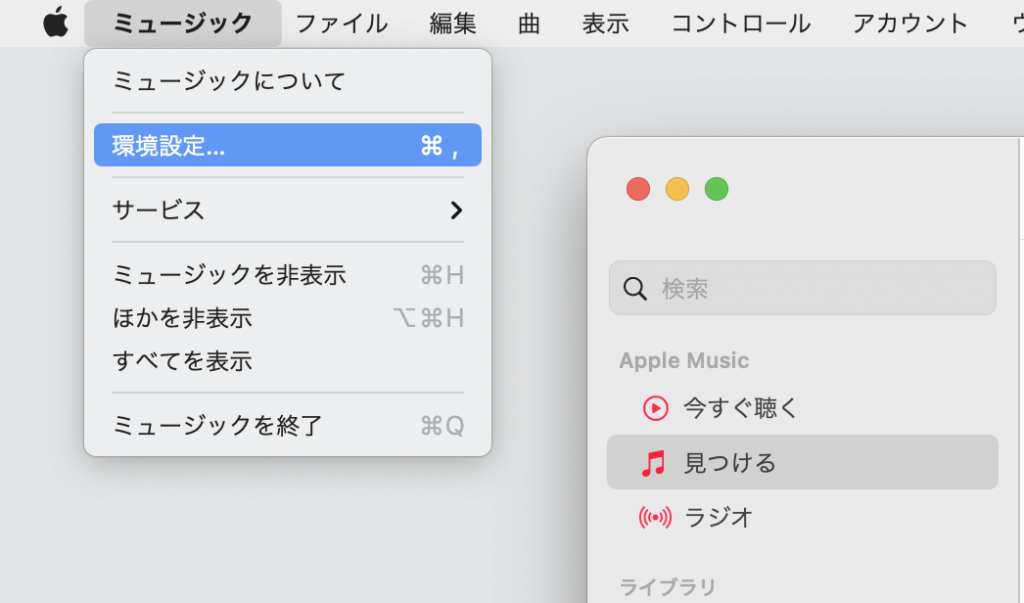 5.上部メニュー内の「ミュージック」から環境設定をクリックします。