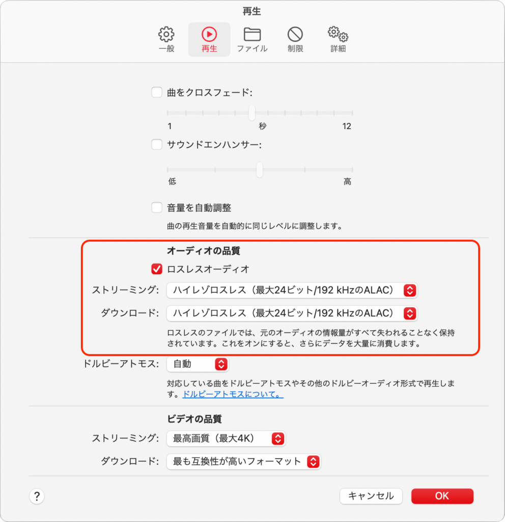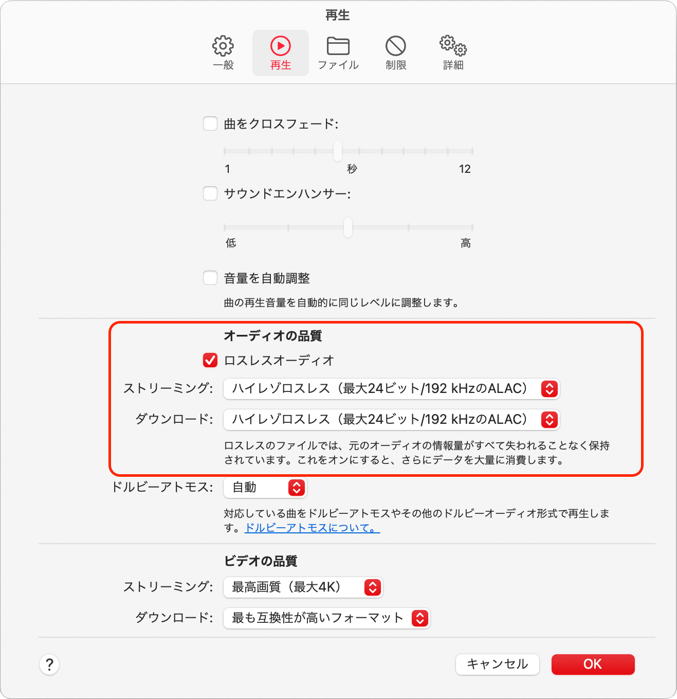 6.表示される画面上部の「再生」ボタンをクリックし、「オーディオ品質」セクションの「ロスレスオーディオ」にチェックを入れます。また、「ストリーミング」及び「ダウンロード」のプルダウンメニューから「ハイレゾロスレス(最大24ビット/192kHzのALAC)」をそれぞれ選択します。