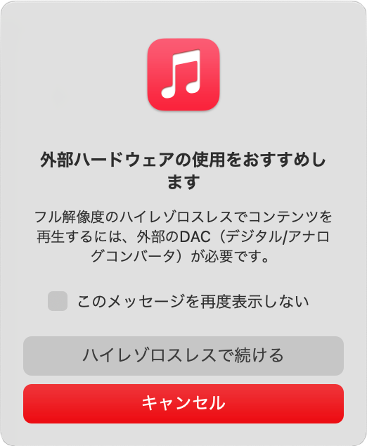 この時に「外部ハードウェアの使用をお勧めします」というメッセージが表示されますので、「ハイレゾロスレスで続ける」ボタンを押して、画面下部の「OK」ボタンをクリックして設定画面を閉じます。