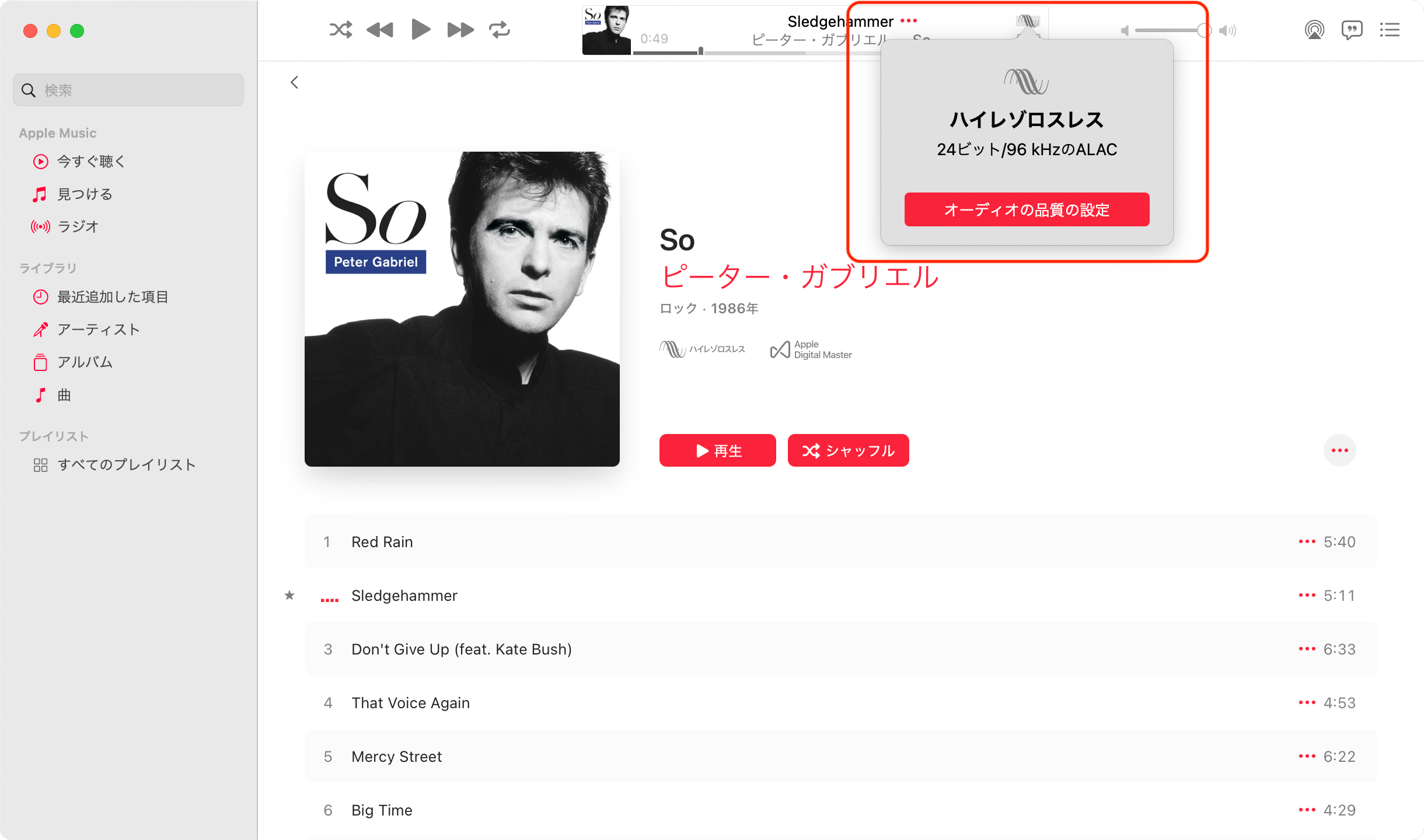 8.Apple Music内で配信されるロスレス音源には44.1kHz、96kHzなどの幾つかのサンプリングレートの違いがあります。再生バーの中にあるロスレスアイコンをクリックするとファイルのサンプリングレート及びビットレートが表示されます。