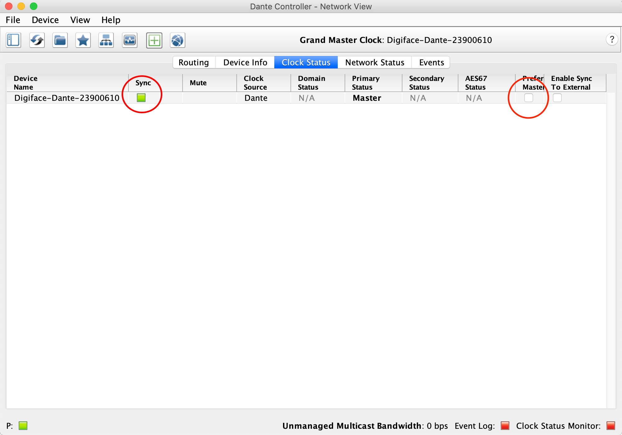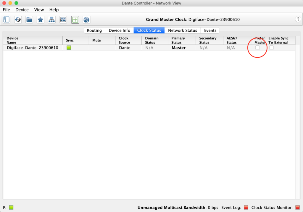 ライブ録音の現場では、必ずと言って良いほどFOHがクロック・マスターになっています。よってDigiface Danteは、スレーブとして接続します。もしDigiface Danteの設定がマスターのままDanteネットワークに接続する場合、接続したと同時にシステムのマスターになってしまう可能があります。このシチュエーションは必ず避けたいので、事前に「Clock States」画面で「Preferred Master」のチェックが外れていることを確認します。