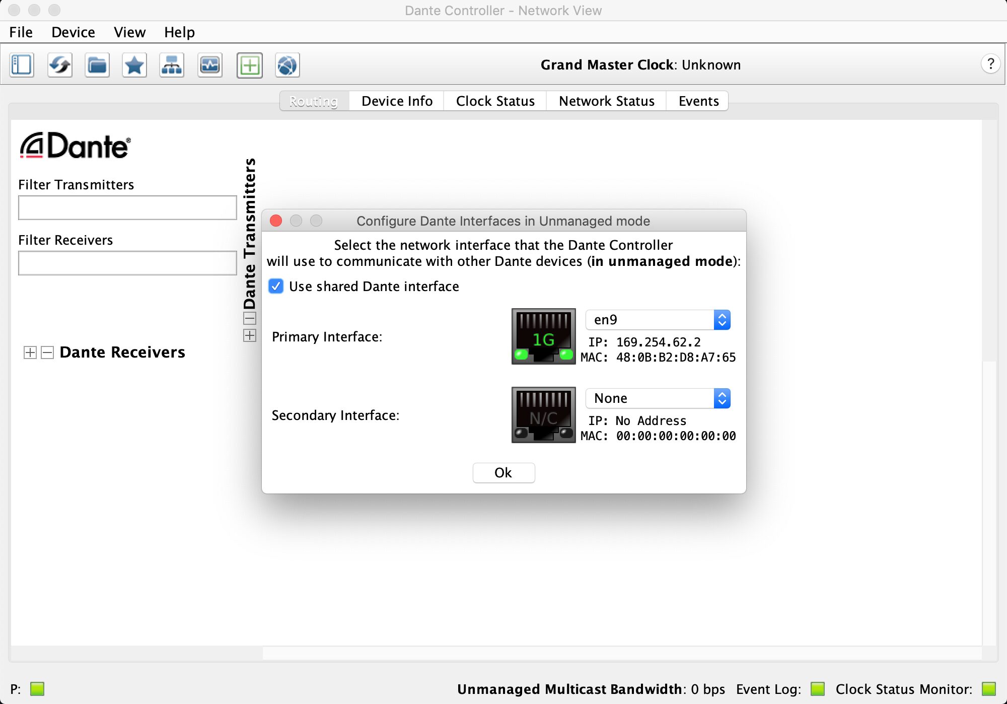両方のインストールが完了したら、Dante Controllerを起動してインターフェイスの設定を行います。