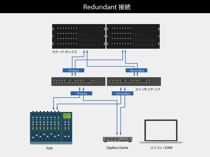 リダンダント接続は、各機器にそれぞれメイン回線(Primary)とバックアップ回線(Secondary)を接続します。