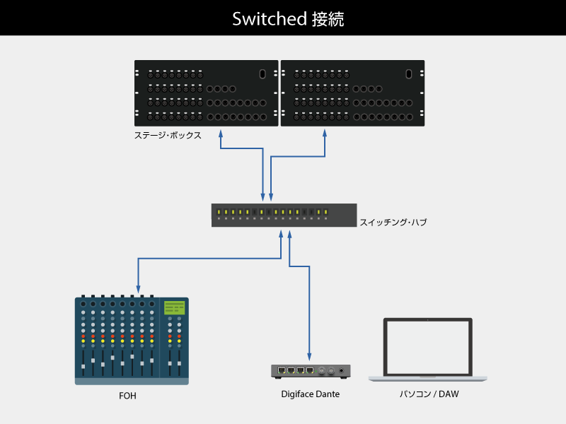 Danteネットワークは、スイッチング・ハブを中心にスター接続で配線することが基本です。
