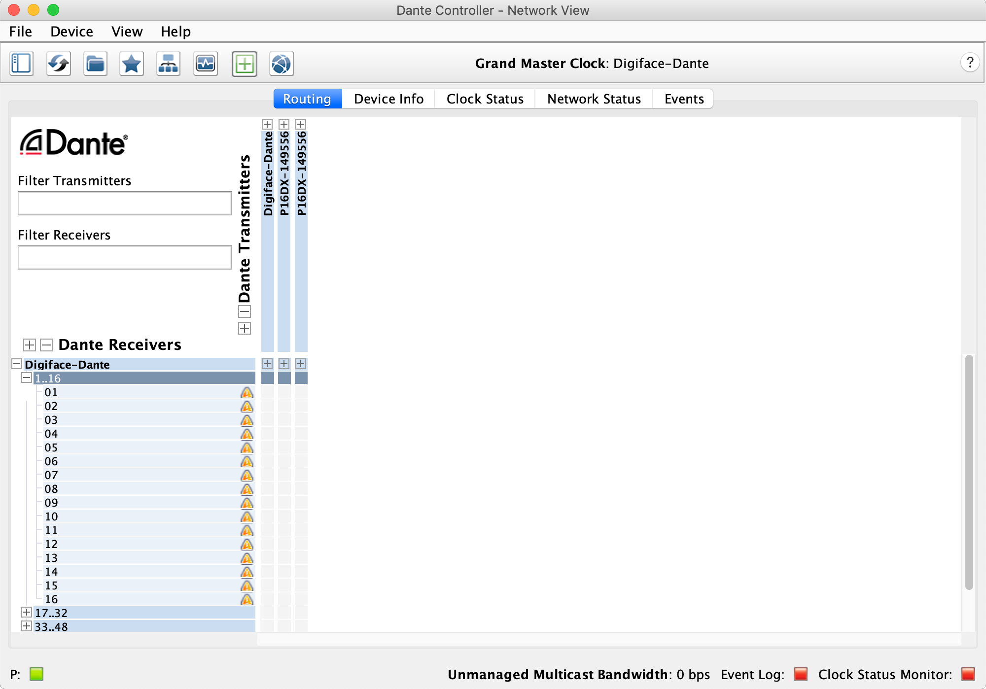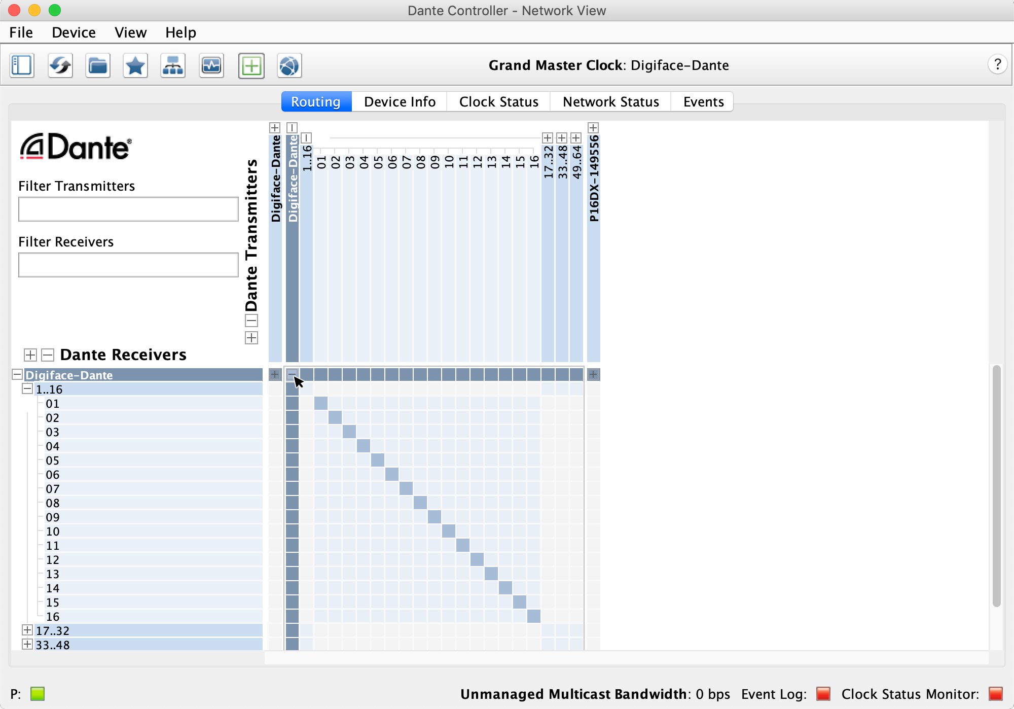 上の列が送信側(Transmitters)なので、ステージボックスのツリーを開きます。Digiface Danteの名称とステージボックスの名称がクロスするポイントを[Control]ボタンを押しながらクリックすると、全てのチャンネルが1:1でルーティングされます。任意のチャンネルをDigiface Danteの入力にルーティングする場合には、チャンネル毎にクリックしてアサインをします。1:1で一括設定されたルーティングを削除するには、クロスするポイントを[Control]ボタンと[Shift]ボタンを押しながらクリックします。