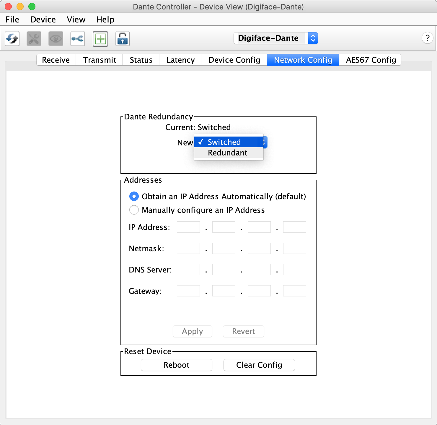 Dante Controllerの初期画面上に表示される製品名(Digiface Dante)をダブルクリックするとDevice Viewが表示されますので、上部のタブで「Network Config」を選択して「Dante Redundancy」設定を任意の値に設定します。