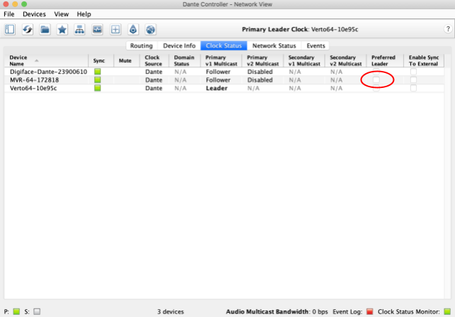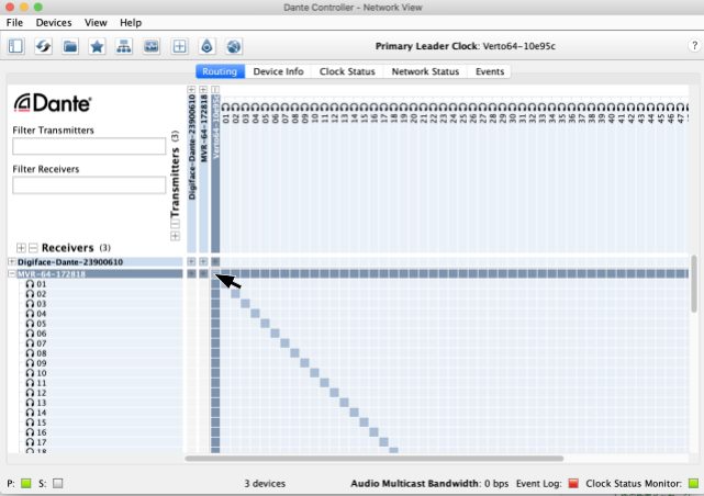 まず、Sync状態を確認し、ステージ・ボックスからの信号をDante Controller上でmultiverterへルーティングします。