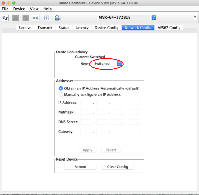 Dante Controllerを起動して「Preferred Master」のチェックが外れていること、サンプリングレートがDanteシステムとマッチしていること、リダンダント設定が正しく設定されているかを確認します。