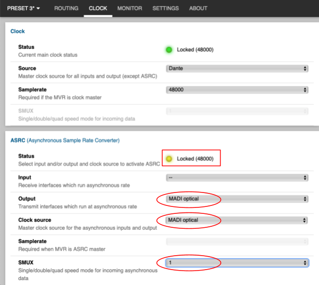 SRCのOutputは「MADI Optical」を選択し、Clock sourceは中継車がクロック・マスターになっているため「MADI Optical」に選択し、SamplerateをMADIシステムに合わせます。