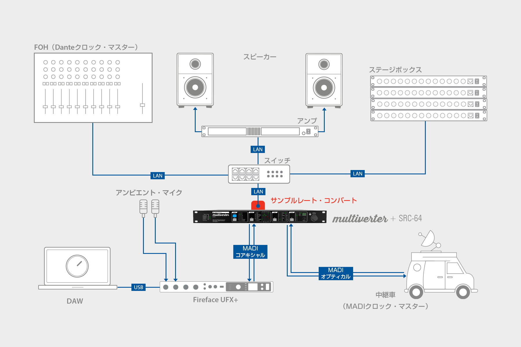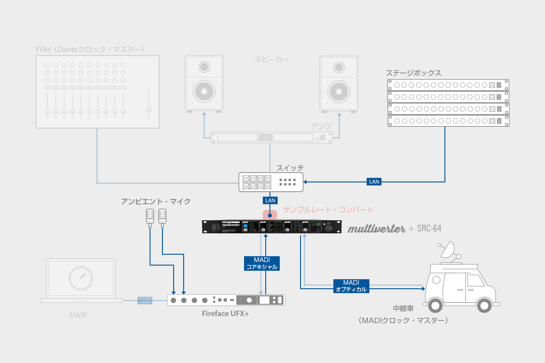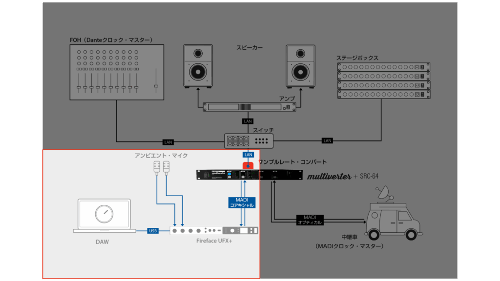 上の図のように、会場の音声はスイッチング・ハブを中心に接続されたDanteシステム内のステージ・ボックスから受け取り、追加のアンビエント・マイクが追加されます。録音と配信/中継にはこのアンビエント・マイクの音声を追加する必要がありますので、Fireface UFX+でMADI回線に統合させて、中継車へと送ります。
