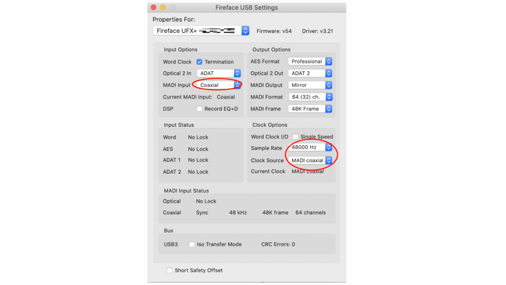 Fireface UFX+のクロックは、Danteに同期したmultiverterに対してスレーブに設定します。
