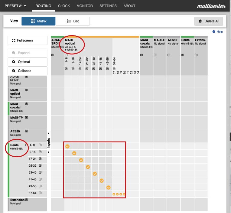 Danteクロック・マスターとMADIシステムのクロックの縁切りは、multiverterのSRCで行われます。