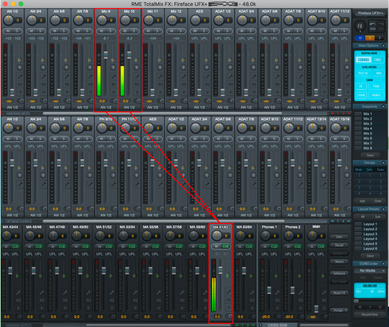 TotalMix FX画面にて、アンビエント・マイクの接続された入力チャンネルをFireface UFX+のMADI出力チャンネルへルーティングします。最下段のハードウェア出力のMA61/62を選択した状態でMic 9/10のフェーダーを0まで上げます。