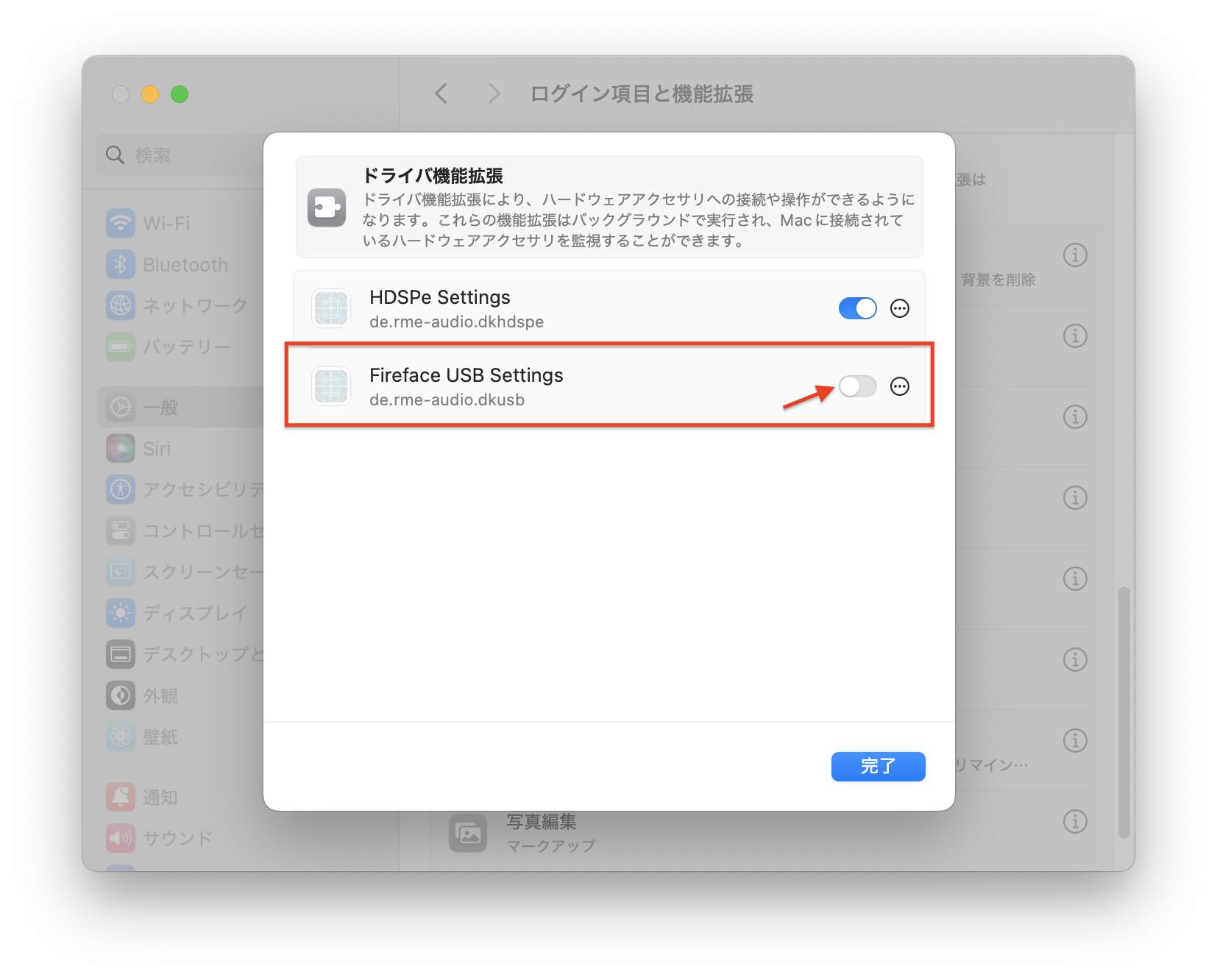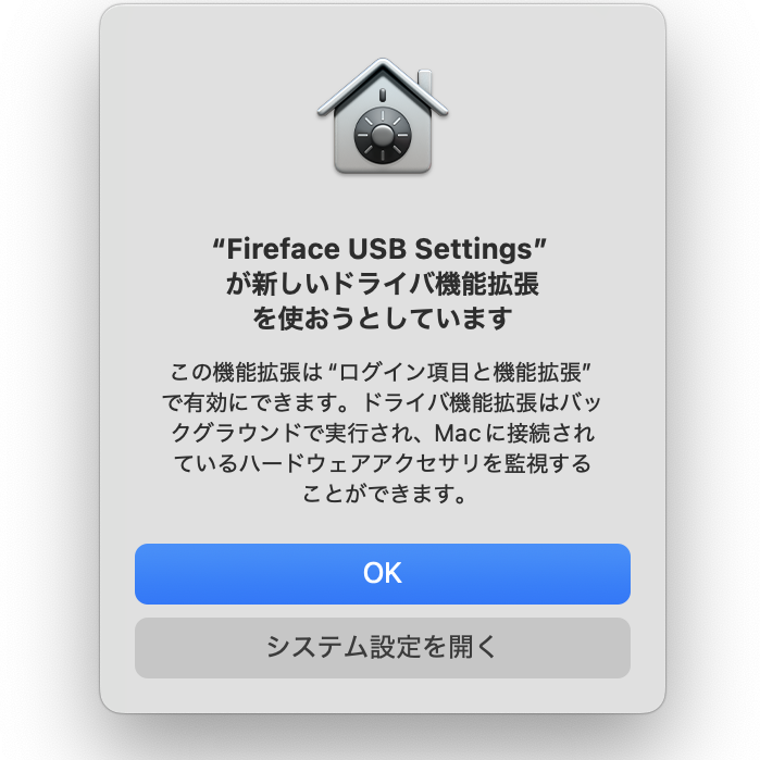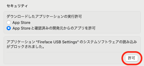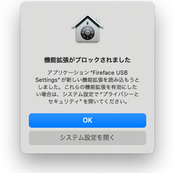 ②表示されるウィンドウで、Fireface USB Settingsのトグルスイッチをクリックすると、システム機能拡張の変更についての許可が求められますので、実行許可を行います。