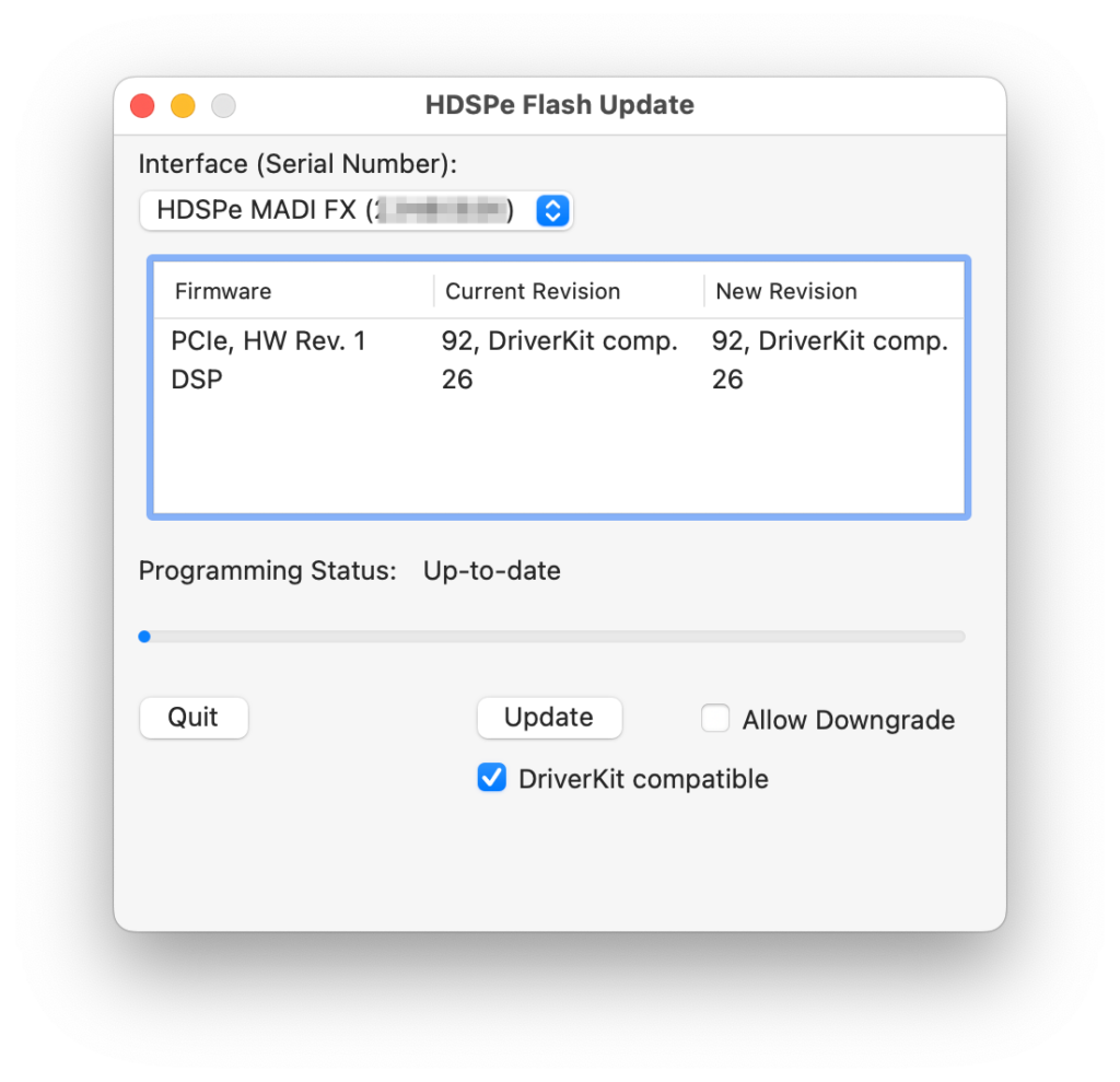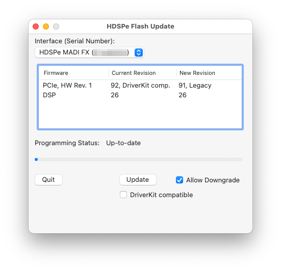 DriverKitドライバーは、HDSPeシリーズに新しいDriverKit対応ファームウェアが搭載されている場合にのみインターフェイスを認識します。そのため、まずカーネル拡張機能ドライバーがインストールされた環境でファームウェアをアップデートしてください。