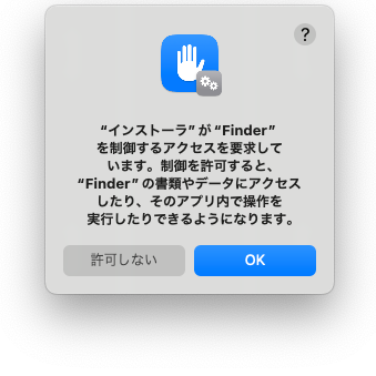 - インストーラがFinderの制御やフォルダへのアクセスを求めるメッセージや表示される場合があります。この場合、[OK] をクリックしてアクセスを許可します。なお、既にこれらが許可されている場合は表示されません。