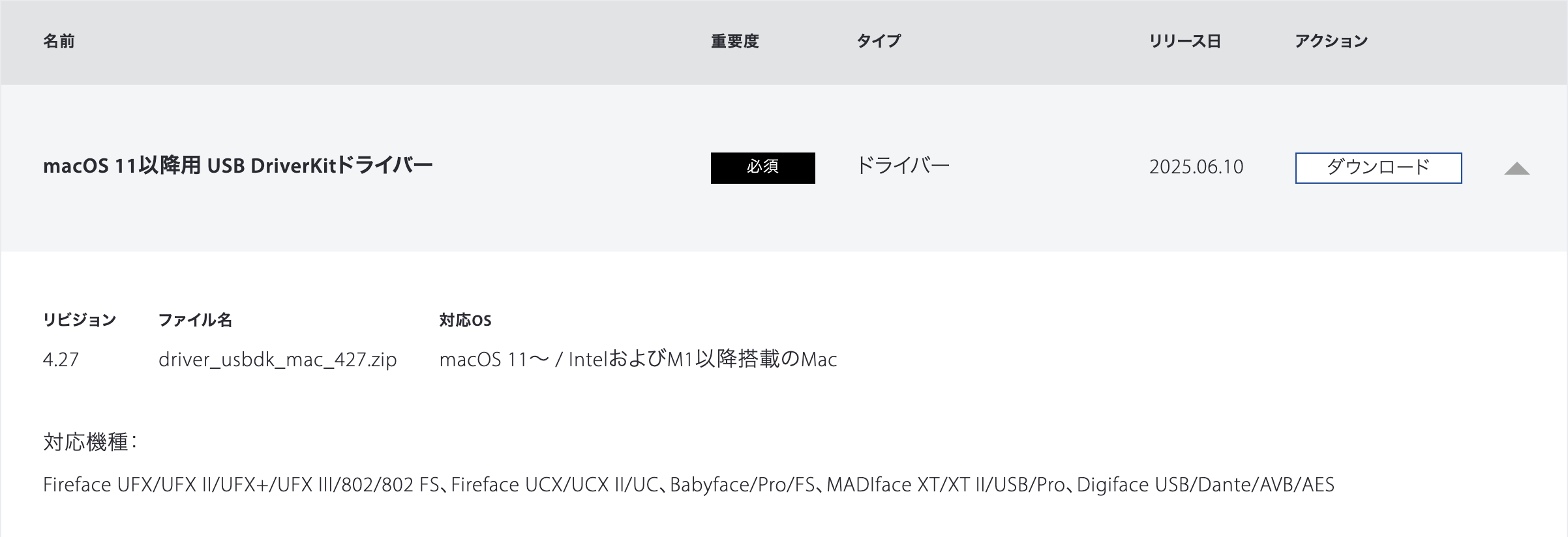 ドライバーをインストールする前に、前項の「DriverKitドライバー対応のファームウェアへ更新する」を必ずお読みください。DriverKitドライバーはダウンロード・ページで、お持ちのデバイスを選択後にmacOSを選択すると、ダウンロード詳細が表示されますので、そちらよりダウンロードしてください。