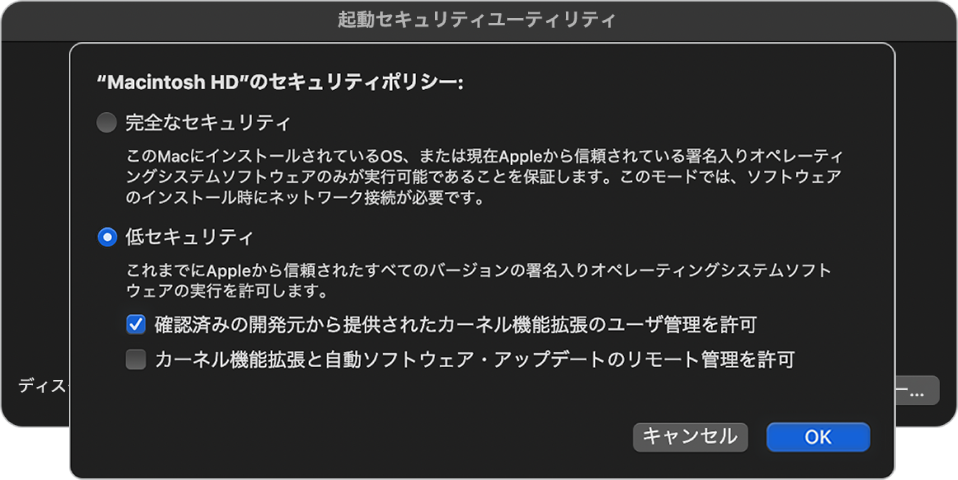 - 「低セキュリティ」→「確認済みの開発元から提供されたカーネル機能拡張のユーザー管理を許可」を選択し、カーネル拡張のユーザ管理を許可します。