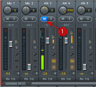 1.エフェクト音のみが必要な場合は、TotalMix FXミキサーを開き、エフェクトを適用したい入力チャンネルの「M」ボタンを押してミュートします。エフェクト音と原音をミックスしたい場合はこの操作は不要です。