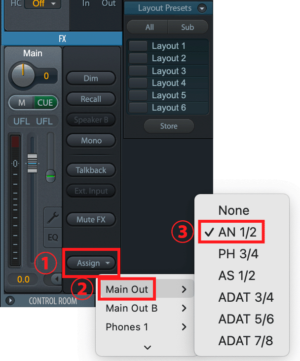 TotalMix FXの右下に表示される「Control Room」セクションの① Assignボタンを押して、② Main Outに利用する出力先を指定します。通常、スピーカーを接続する場合は③ AN 1/2を選びます。もしBabyface Pro FSをヘッドフォンのみで利用する場合には、Main Outに「PH 3/4」を選んでも問題ありません。