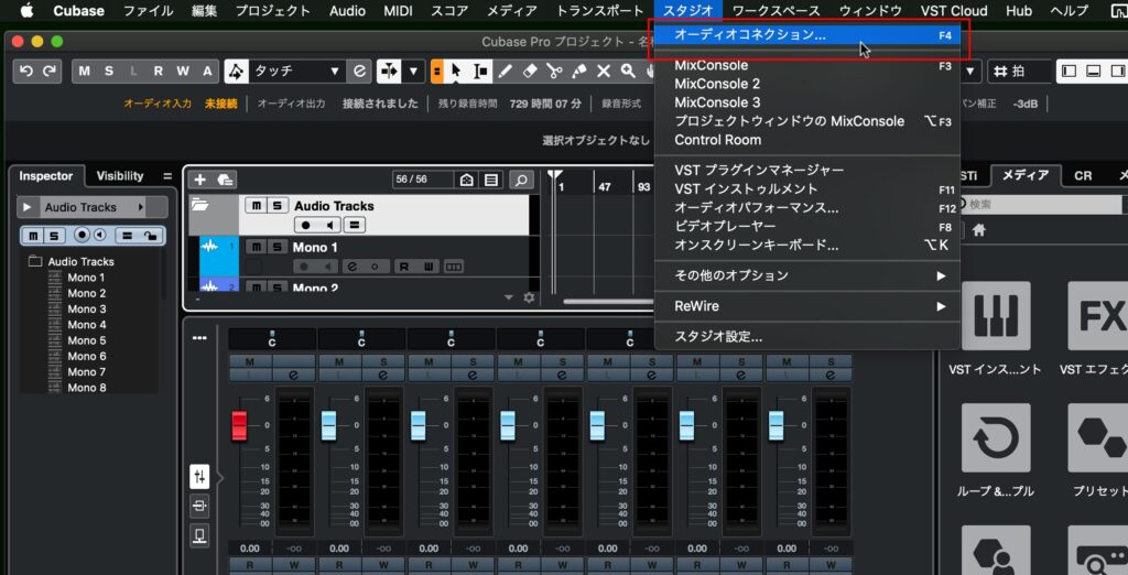 - Nuendo / Cubaseでメニュー「スタジオ」>「オーディオコネクション」を選択します。