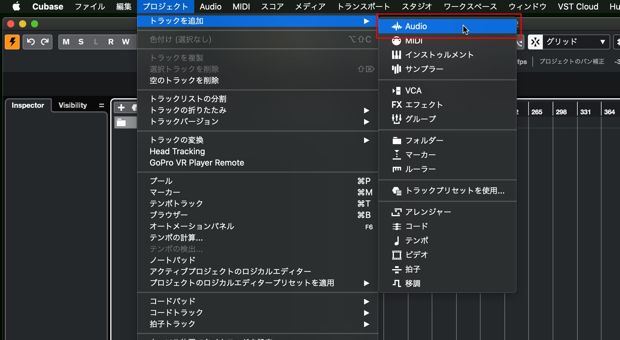 メニュー「プロジェクト」>「トラックを追加」>「Audio」を選択します。