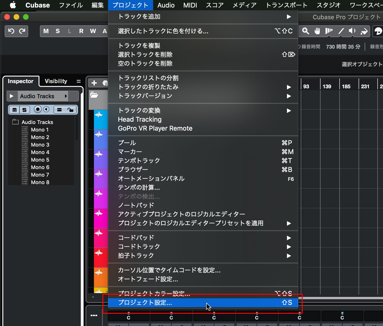 メニューから「プロジェクト」> 「プロジェクト設定…」選択します 。