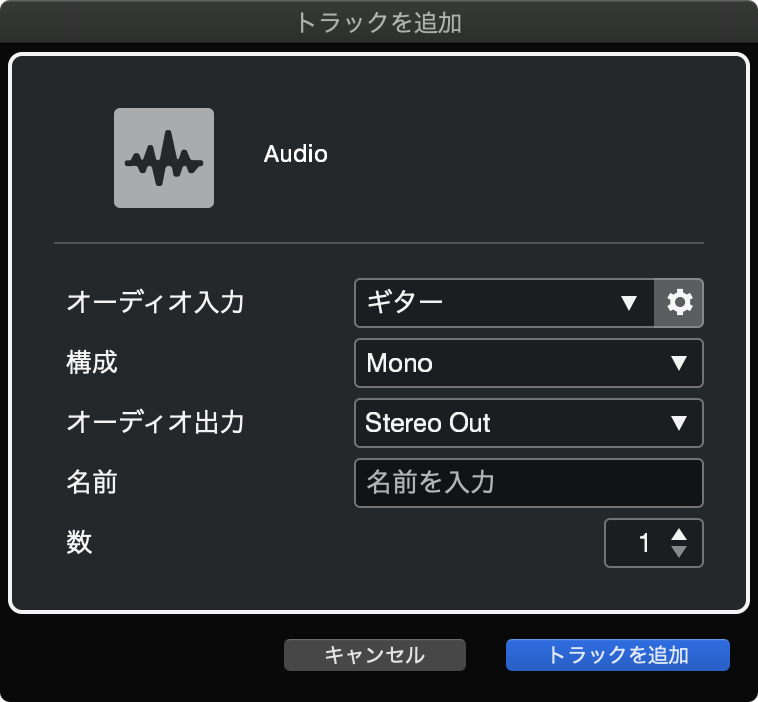 表示される「オーディオを追加」ダイアログの「オーディオ入力」メニューの「バスに接続」欄から上で作成した入力バスを選択します。必要に応じて「名前」「数」を設定し、「トラックを追加」ボタンを押すとトラックが追加されます。