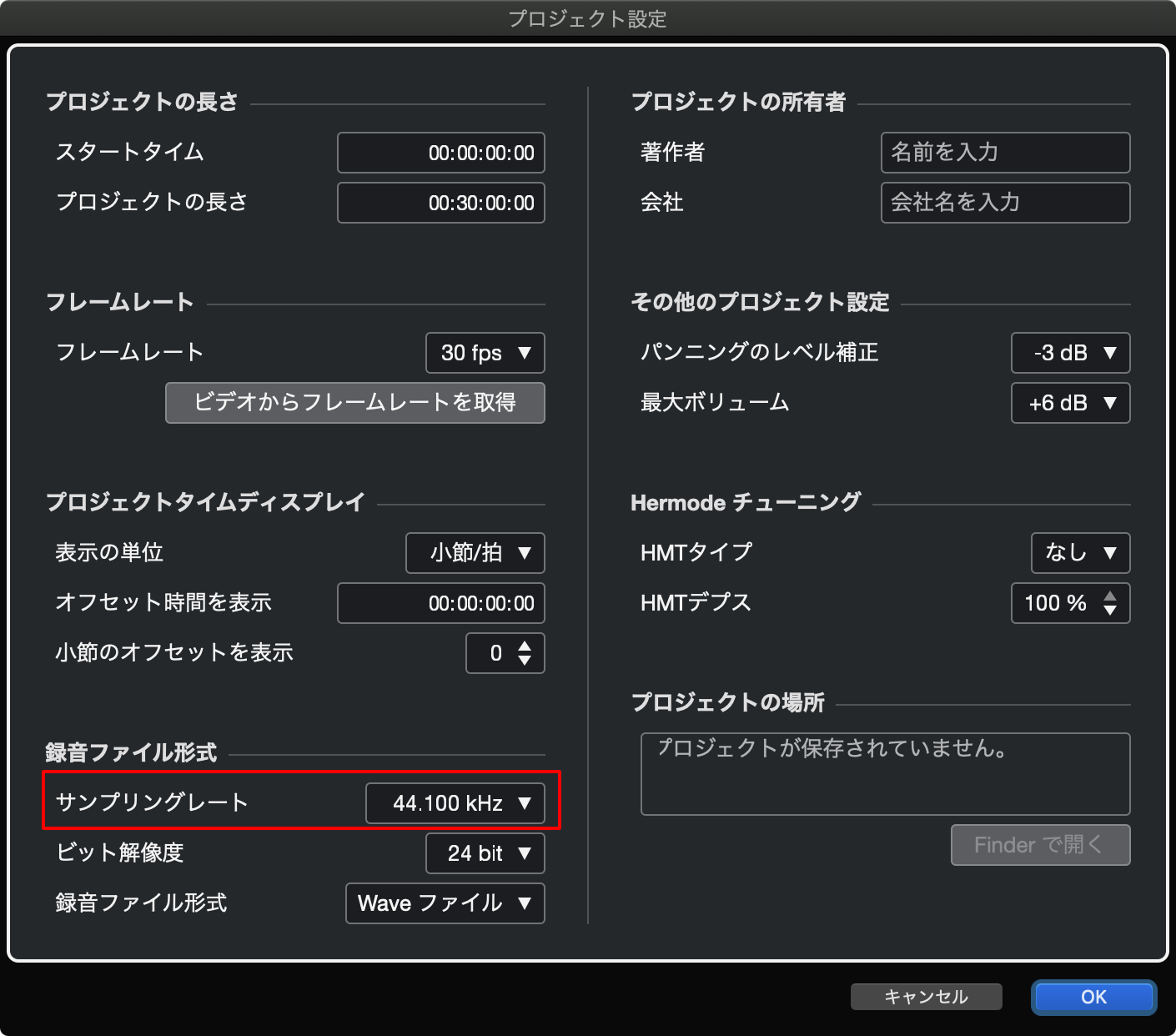 表示される「プロジェクト設定」画面の「サンプリングレート」メニューで目的のサンプル・レートを選択します。