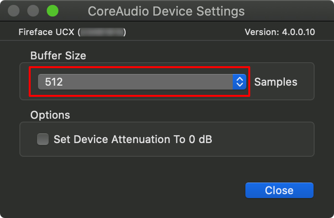 表示される「CoreAudio Device Settings」画面の「Buffer Size」メニューから、目的のバッファー・サイズを選択します。
