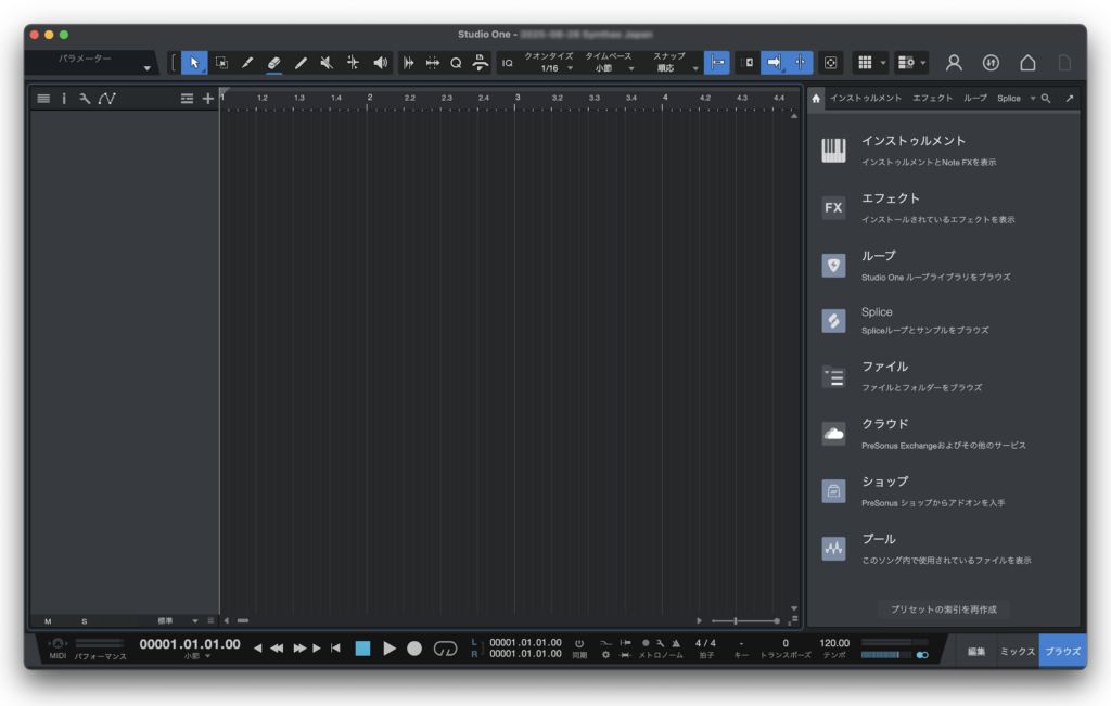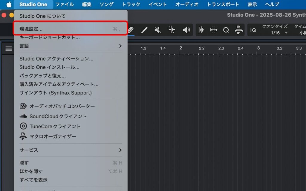 上部のメニューから、「Studio One」>「環境設定」を選択します。