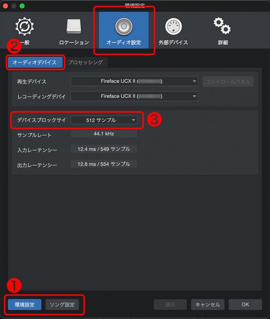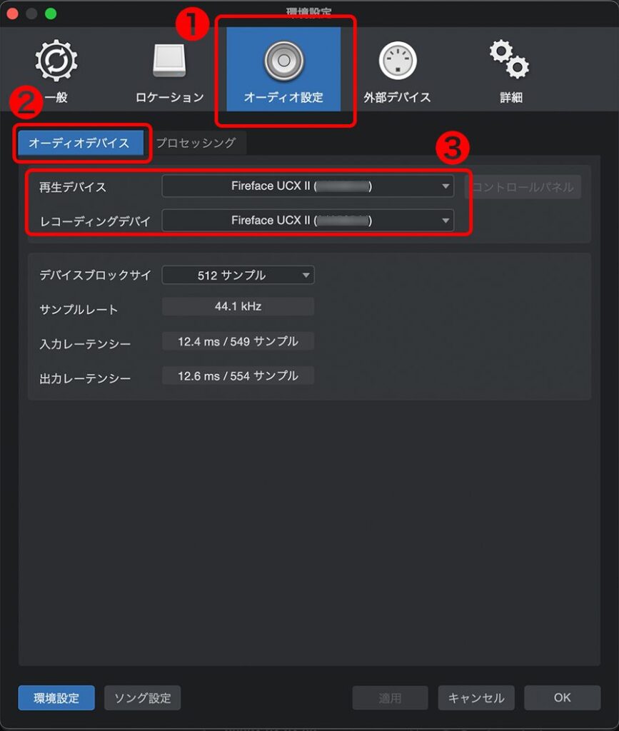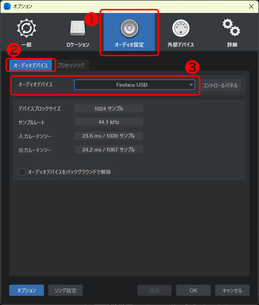 3. 「オーディオデバイス」メニューからお使いのRMEインターフェイス・ドライバーを選択