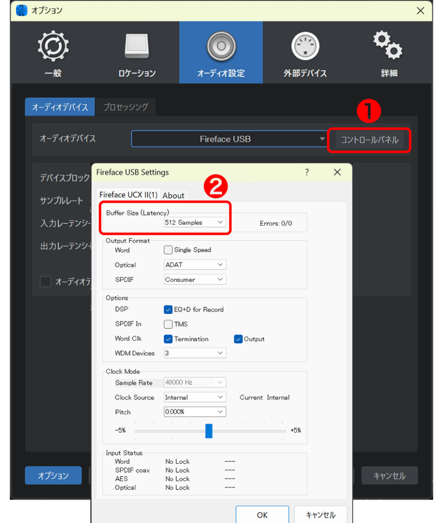 1. 「オプション」画面のオーディオデバイスメニュー画面右にある「コントロールパネル」ボタンを押して、RMEインターフェイスのSettingsダイアログを開きます。