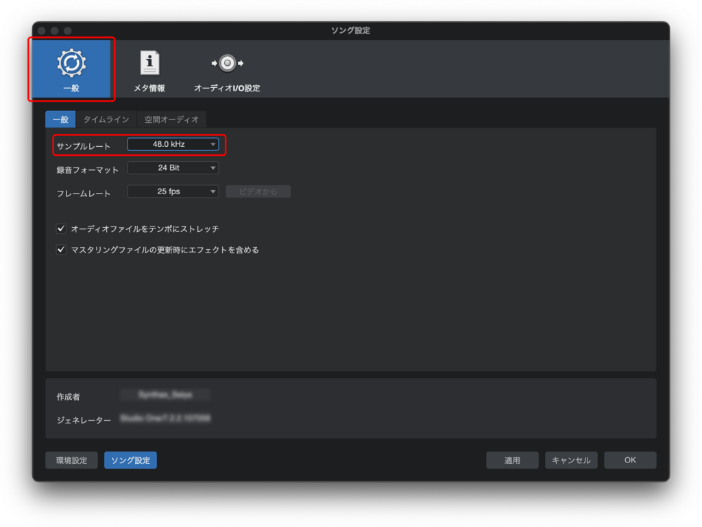 次に「ソング設定」画面の「一般」タブをクリックし、「サンプルレート」メニューから使用するサンプル・レートを選択します。