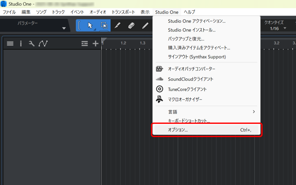 上部のメニューから、「Studio One」>「オプション…」を選択します。