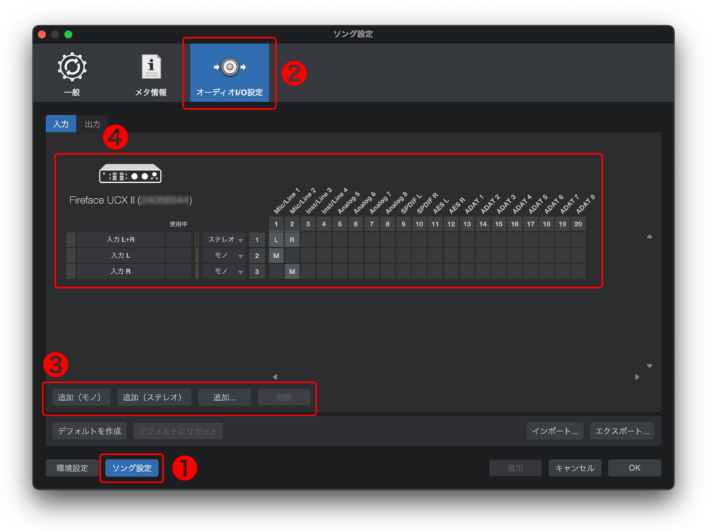 3. 入出力チャンネルを追加する場合は「入力」または「出力」タブを選択し、「追加(モノ)」「追加(ステレオ)」ボタンにてモノラルまたはステレオ・チャンネルを追加します。「追加…」ボタンで一度に複数チャンネルの追加も可能です。