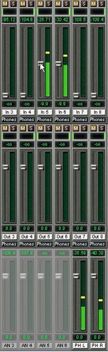 3列目の出力4を再度クリックし、オリジナルのボーカル信号とリバーブがシンガーにとって最適にミックスされるまで、入力1のフェーダーを下げていきます。
