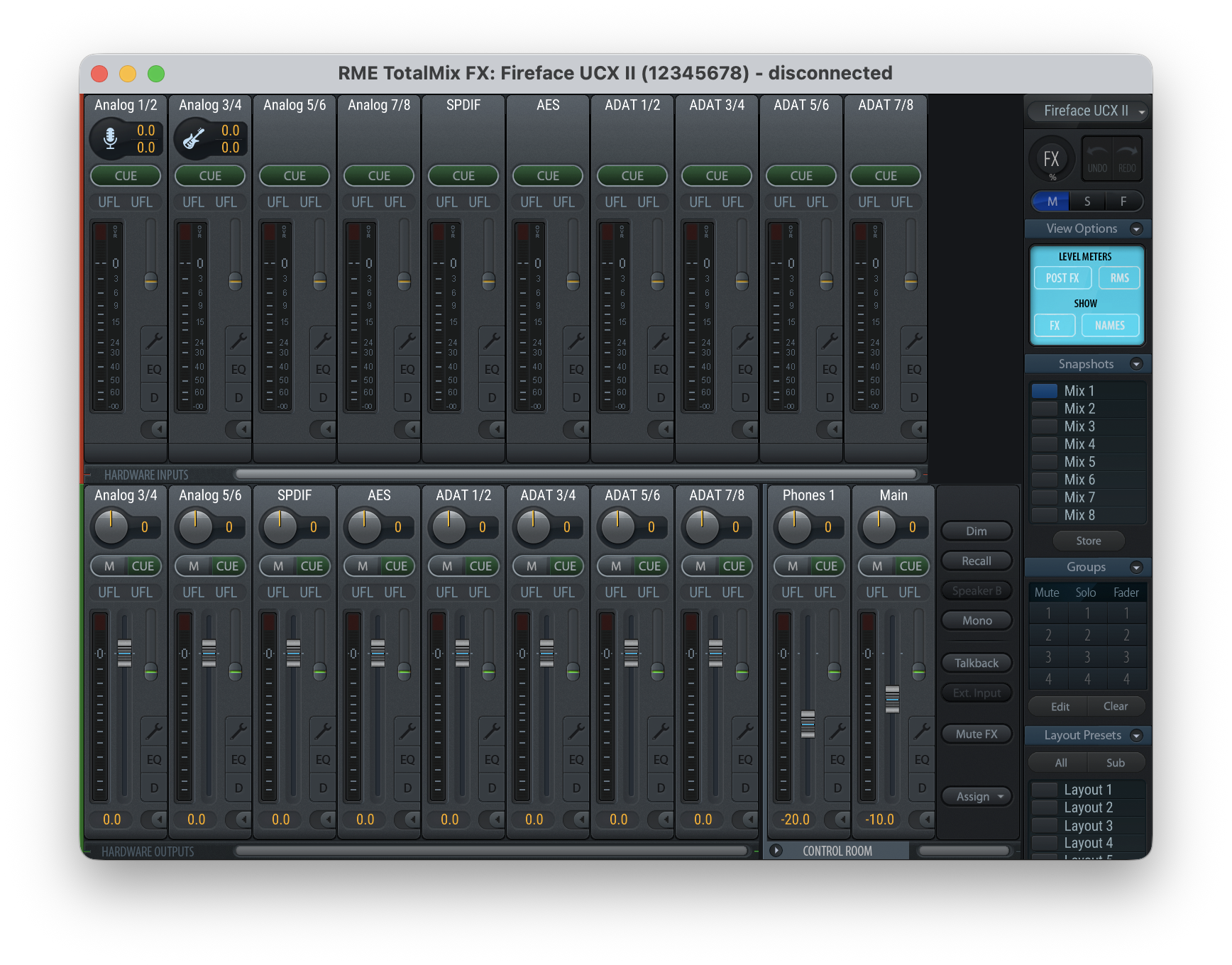 6. 再度TotalMix FXを起動することで、Fullモードの画面に戻ります。