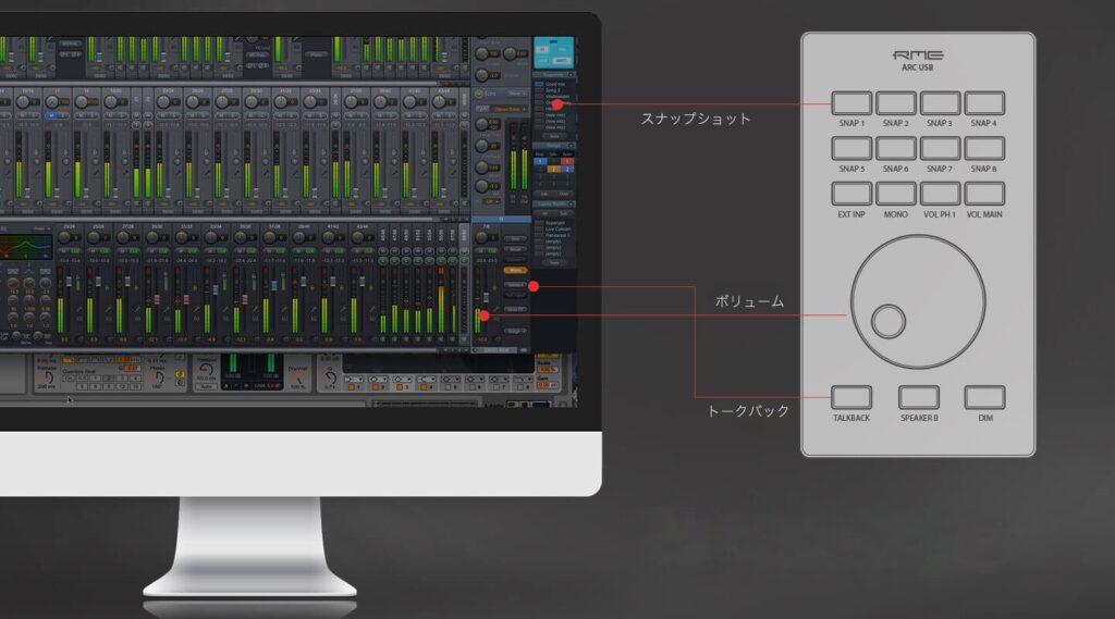 - ボリューム、ディム、スピーカー切り替えなど、TotalMixの多くの機能をフル・コントロール