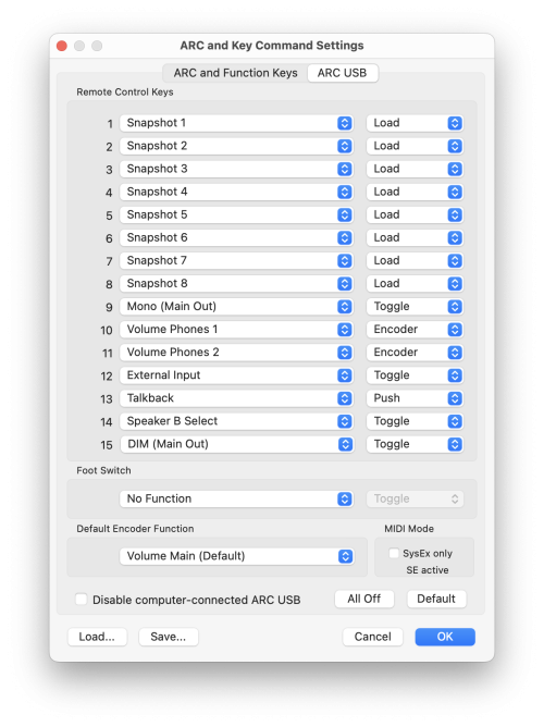 Fireface UFX III / UFX II / UFX 802 FS / UFX + / UCX II、MADIface XT IIは、ARC USBを本体のUSBポートに接続することにより、スタンドアローン・モードでの使用が可能です。スタンドアローン・モードでARC USBを使用する場合は、あらかじめ各ボタンにプリセットされたキー・コマンドを使用することができます: