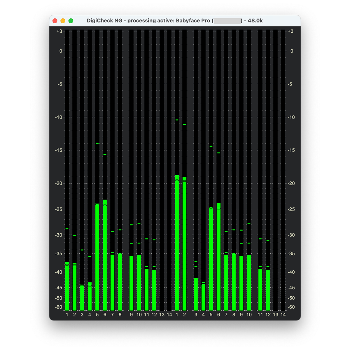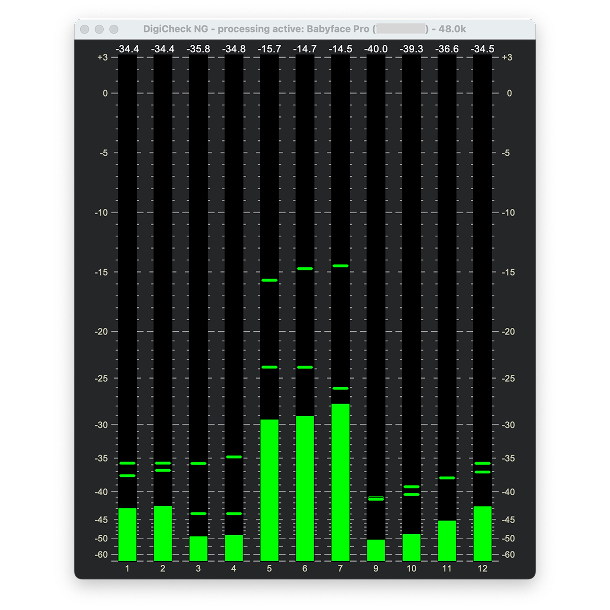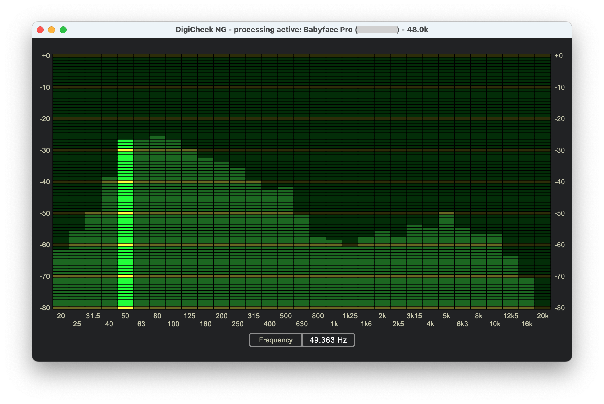 最後の列は、入力信号のDC成分を示しています。これには、急峻なローパスフィルター(バージョン0.90以降、2段階)とそれに続く緩やかな積分が使用されます。表示はデジタルフルスケール(2^23 – 1)に対するdBで、「+」または「-」は極性を示します。非常に低い周波数では、フィルターはDC信号を抽出できず、表示値は変動します。