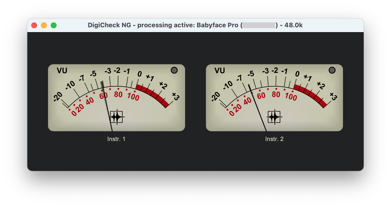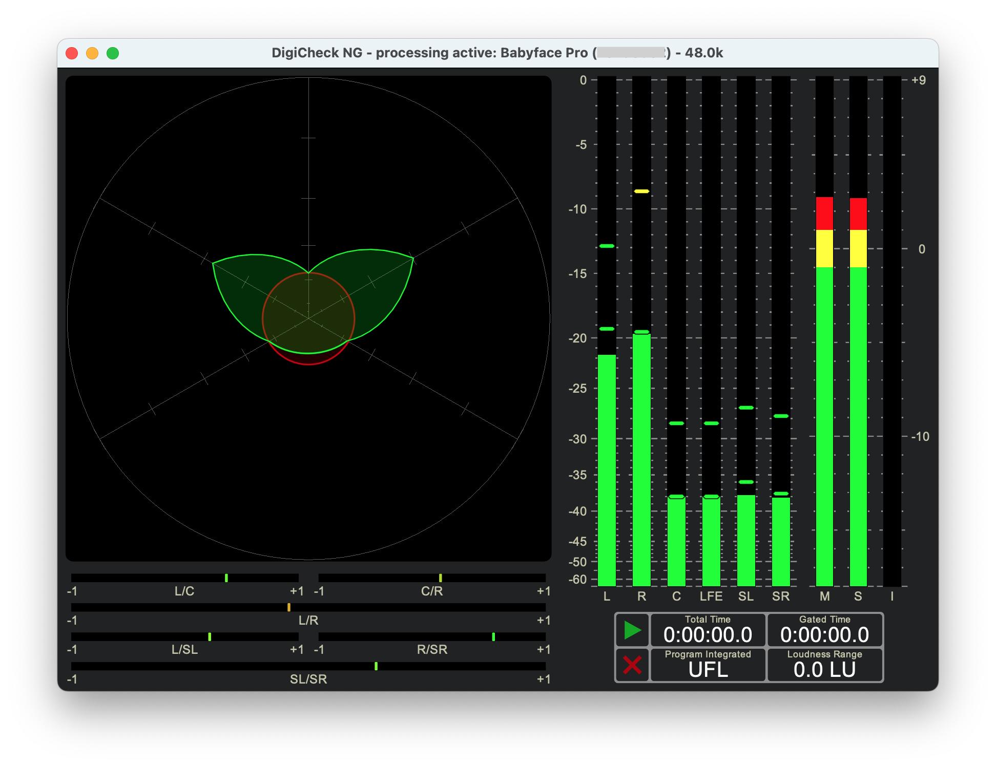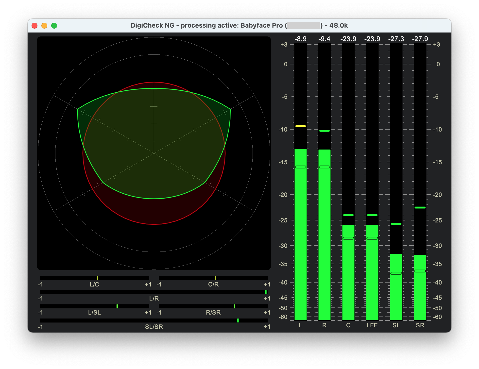 最後の列は、入力信号のDC成分を示しています。これには、急峻なローパスフィルター(バージョン0.90以降、2段階)とそれに続く緩やかな積分が使用されます。表示はデジタルフルスケール(2^23 – 1)に対するdBで、「+」または「-」は極性を示します。非常に低い周波数では、フィルターはDC信号を抽出できず、表示値は変動します。